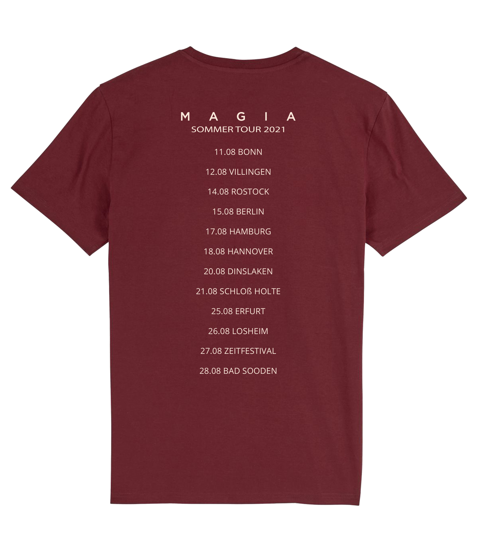 Das Alvaro Soler "Magia" Sommertour Shirt in Dunkelrot, besteht aus 100% Bio-Baumwolle, kommt in normalem Schnitt und hat einen hochwertigen Frontprint auf der Brust und einen Backprint mit den Tourdates.